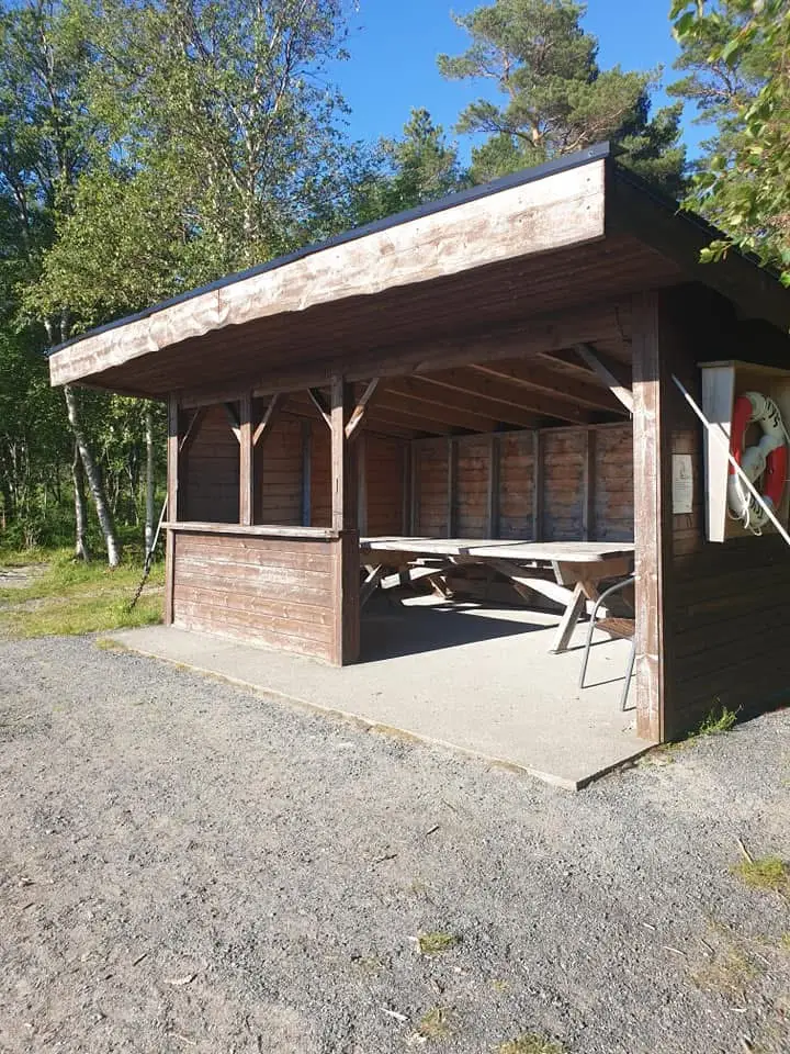 Barnevennlig badeplass med flott sandstrand, stor parkeringsplass, toalettfasiliteter, gapahuk og grillmuligheter – perfekt for en sommerdag for hele familien.